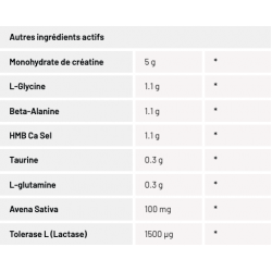 mélange de concentré de protéines de lactosérum (lait) et d'isolat de protéines de soja, maltodextrine, poudre de cacao (uniquement dans la variante chocolat), huile MCT (triglycéride à chaîne moyenne) (de graisse de palme), arôme, colorant : poudre de betterave rouge, carmin (uniquement dans la variante Fraise), Stabilisants : gomme de guar, gomme de xanthane, fructo-oligosaccharides (FOS), Tolerase™ L (lactase à pH stable), mélange d'édulcorants non nutritifs (sucralose, acésulfame-K), chlorure de sodium, extrait de tribulus terrestris L., bisglycinate de magnésium, oxyde de magnésium, lactate de zinc, pyridoxine HCI.